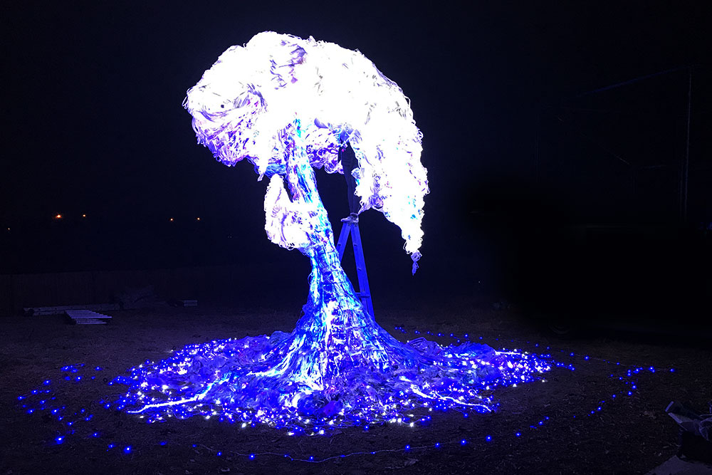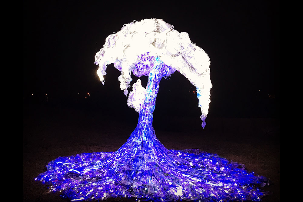 「星光(guāng)潮來 Dreamy Tide」,用(yòng)回收塑膠袋、Led燈條做(αzuò)成可(kě)以飄逸在空(kōng)中的(de)海(hǎi)浪,讓人(rén)掀起來躺在其中看(kàn)裡面的(de)燈光(guāng)投射,感覺"好(hǎo)像在海(hǎi)裡,也(yě)好(hǎo)像在星空(kōng)下(xià)感受塑膠袋飄揚,或有(yǒu)人(rén)觸碰也(yě)如(rú)海(hǎi)σ浪聲一(yī)般。
